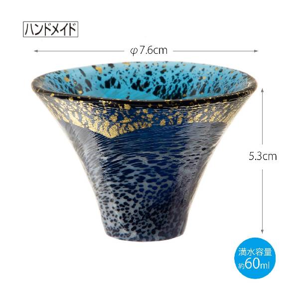 以富士山為主題的清酒杯,藍色半透的杯身加上金箔及白色花紋作點綴。